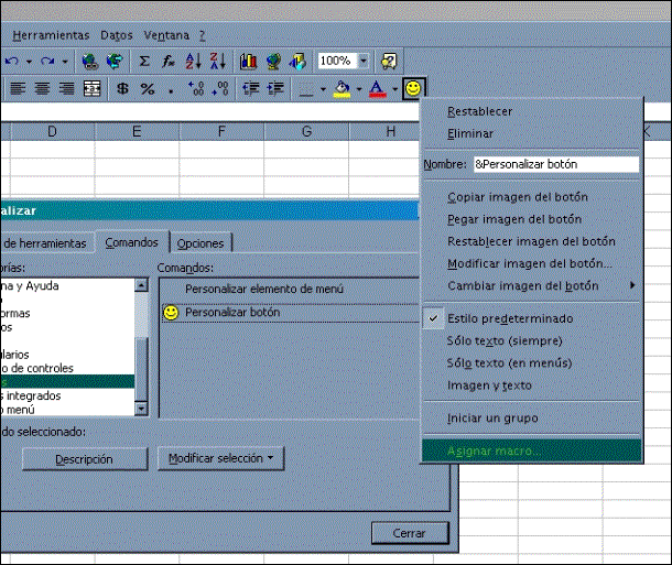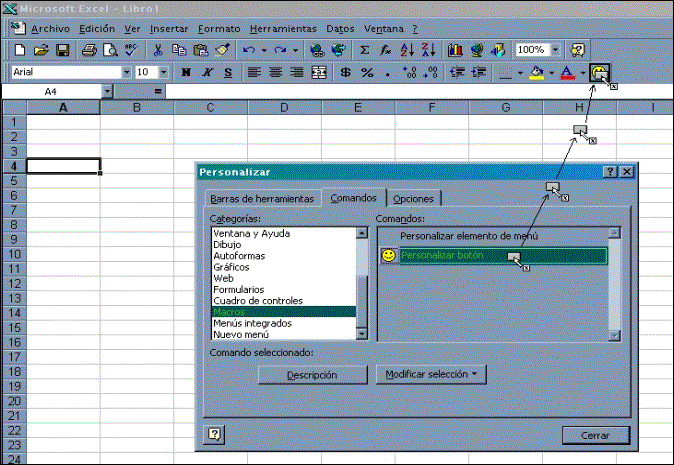 Podemos encontrar la ventana anterior en el menú Ver, sub-menú Barra de herramientas opción Personalizar… Seleccionando la categoría Macros nos encontraremos con la opción Personalizar Botón, donde arrastrando el botón a la barra de herramientas se insertará el ícono que podremos asignar y modificar como queramos. En la siguiente figura podemos ver este proceso.