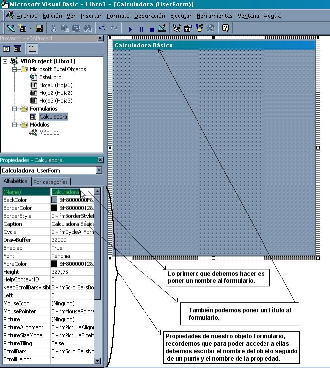 Como dijimos anteriormente, podemos crear objetos y en este caso, una ventana (o formulario como le llamaremos aquí). Un formulario tiene propiedades, que son las que le indicarán por ejemplo el nombre, que es por medio del cual nos referiremos al objeto. Por ejemplo, si queremos cambiar alguna propiedad del formulario que creamos en la figura 27 deberemos hacer referencia a sus atributos por medio del nombre que le pusimos. O sea, si queremos ponerle un título (propiedad Caption) podemos escribir “Calculadora.Caption=”Calculadora Básica” y lo mismo para los demás atributos.