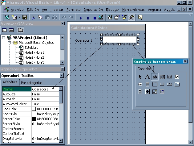 Los objetos insertables son los que aparecen en el Cuadro de herramientas. La etiqueta (que dice Operador 1) se puede insertar seleccionando el control que se encuentra a la izquierda del control cuadro de texto que se muestra en la imagen 28.
