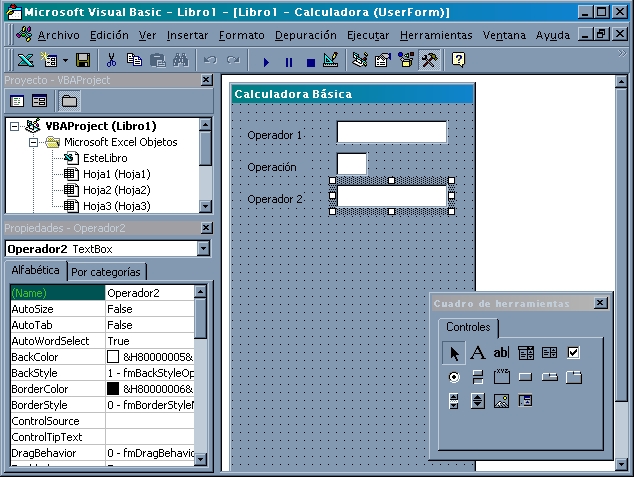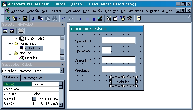 Por ejemplo, si deseamos crear nuestra calculadora básica (ejercicio c de la sección de macros manuales) podríamos crear un diseño de formulario como se muestra en las figuras siguientes.