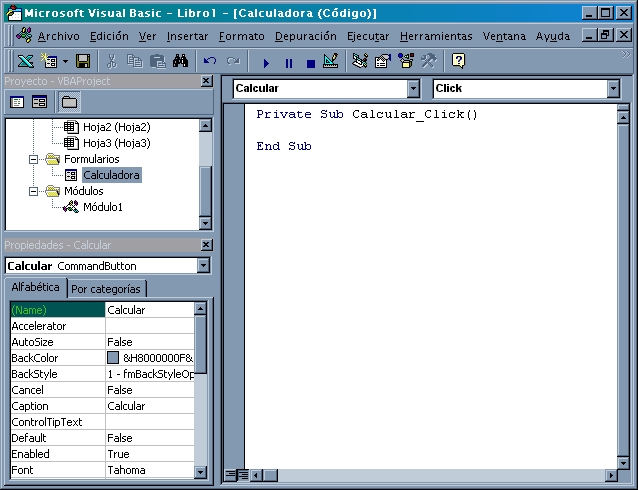Private Sub Calcular_Click() à Inicio de nuestro código. Esta escrito en el evento Click (o sea, cuando se hace click en el botón).