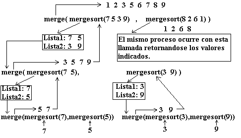 Este método de ordenamiento toma la lista de llaves y la divide en dos partes, las cuales se ordenan en forma independiente. Finalmente, las dos listas ordenadas resultantes, se mezclan para formar la lista ordenada final.